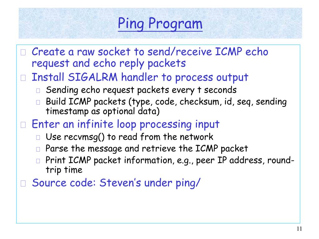 Create a raw socket to send/receive ICMP echo request and echo reply packets Install SIGALRM handler to process output Sending echo request packets every t seconds Build ICMP packets (type, code, checksum, id, seq, sending timestamp as optional data) Enter an infinite loop processing input Use recvmsg() to read from the network Parse the message and retrieve the ICMP packet Print ICMP packet information, e.g., peer IP address, round-trip time Source code: Steven’s under ping/ Ping Program