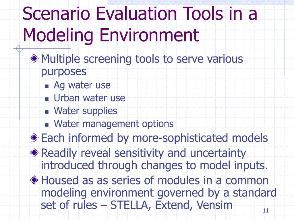Scenario Evaluation Tools in a Modeling Environment • Multiple screening tools to serve various purposes • Ag water use • Urban water use • Water supplies • Water management options • Each informed by more-sophisticated models • Readily reveal sensitivity and uncertainty introduced through changes to model inputs. • Housed as as series of modules in a common modeling environment governed by a standard set of rules – STELLA, Extend, Vensim