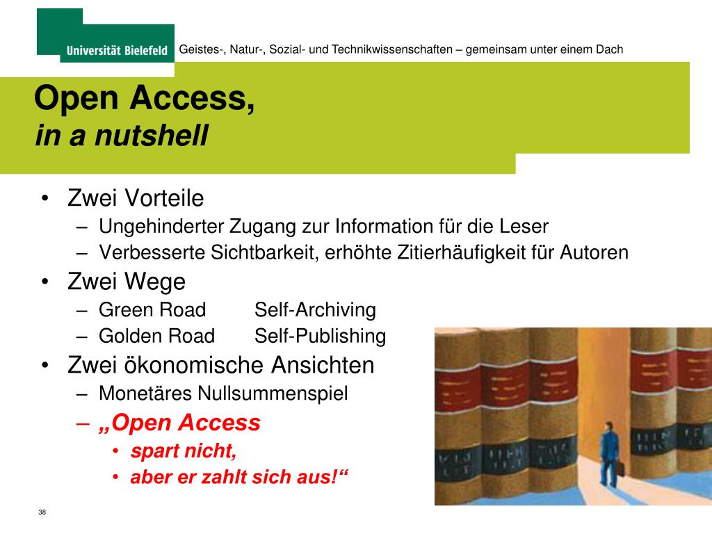 Zwei Vorteile Ungehinderter Zugang zur Information für die Leser Verbesserte Sichtbarkeit, erhöhte Zitierhäufigkeit für Autoren Zwei Wege Green Road Self-Archiving Golden Road Self-Publishing Zwei ökonomische Ansichten Monetäres Nullsummenspiel „Open Access spart nicht, aber er zahlt sich aus!“ Open Access,in a nutshell