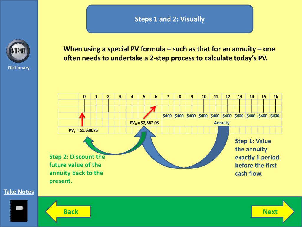 Steps 1 and 2: Visually When using a special PV formula – such as that for an annuity – one often needs to undertake a 2-step process to calculate today’s PV. Dictionary Step 1: Value the annuity exactly 1 period before the first cash flow. Step 2: Discount the future value of the annuity back to the present. Take Notes Back Next
