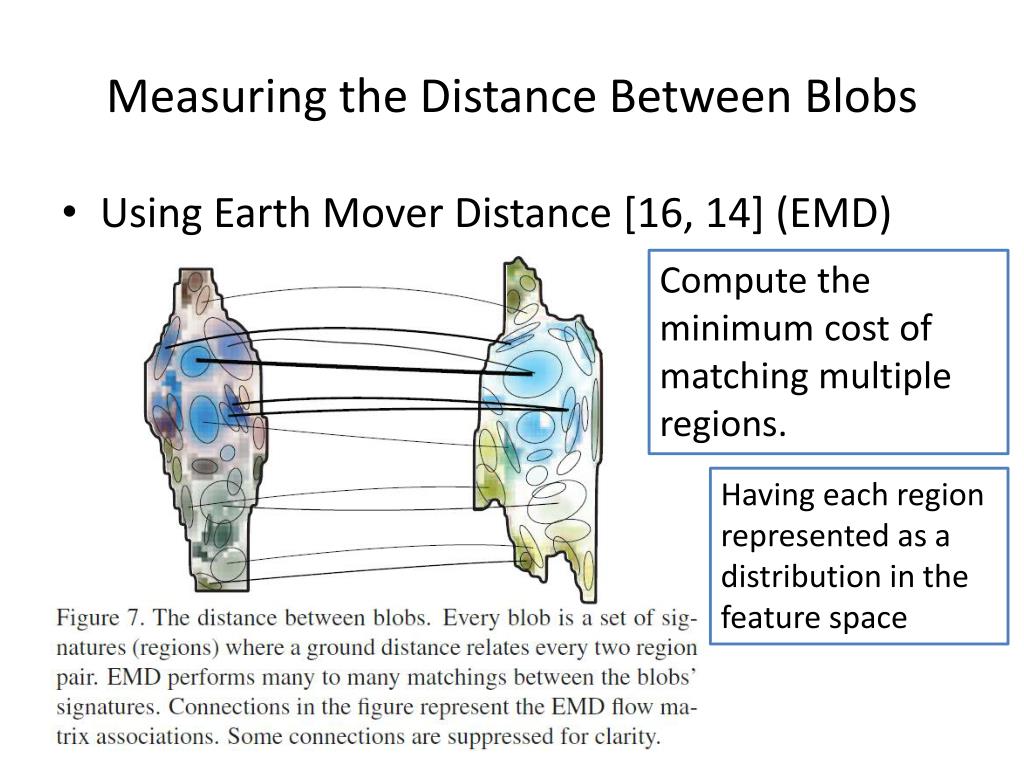Measuring the Distance Between Blobs • Using Earth Mover Distance [16, 14] (EMD) Compute the minimum cost of matching multiple regions. Having each region represented as a distribution in the feature space