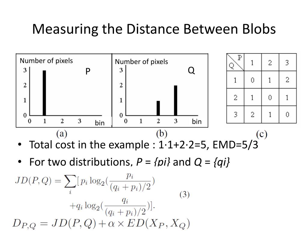 Measuring the Distance Between Blobs Number of pixels Number of pixels • Total cost in the example : 1·1+2·2=5, EMD=5/3 • For two distributions, P = {pi} and Q = {qi} Q P bin bin