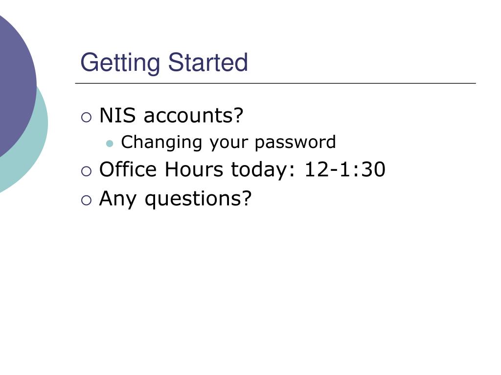 Getting Started • NIS accounts? • Changing your password • Office Hours today: 12-1:30 • Any questions?