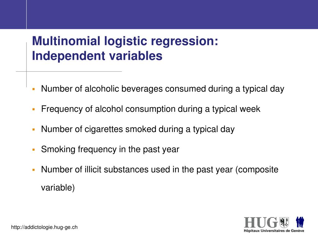 Number of alcoholic beverages consumed during a typical day Frequency of alcohol consumption during a typical week Number of cigarettes smoked during a typical day Smoking frequency in the past year Number of illicit substances used in the past year (composite variable) Multinomial logistic regression:Independent variables