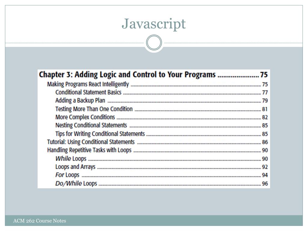 Adding Logic <script type="text/javascript"> var num= prompt(‘Enter a number', ‘60'); if (num >= 50) { alert(‘Thanks.'); } </script> ACM 262 Course Notes