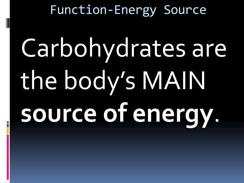 Function-Energy Source Carbohydrates are the body’s MAIN source of energy.