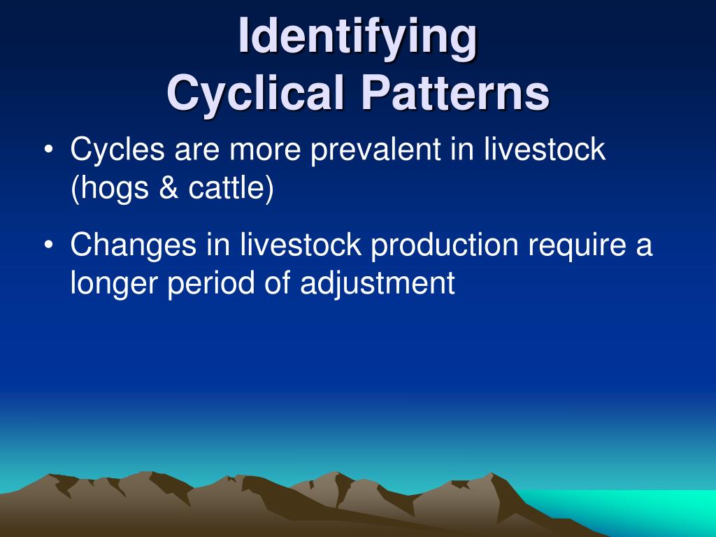 IdentifyingCyclical Patterns • Cycles are more prevalent in livestock (hogs & cattle) • Changes in livestock production require a longer period of adjustment