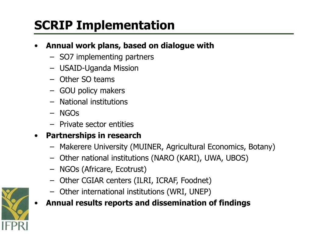 SCRIP Implementation • Annual work plans, based on dialogue with • SO7 implementing partners • USAID-Uganda Mission • Other SO teams • GOU policy makers • National institutions • NGOs • Private sector entities • Partnerships in research • Makerere University (MUINER, Agricultural Economics, Botany) • Other national institutions (NARO (KARI), UWA, UBOS) • NGOs (Africare, Ecotrust) • Other CGIAR centers (ILRI, ICRAF, Foodnet) • Other international institutions (WRI, UNEP) • Annual results reports and dissemination of findings