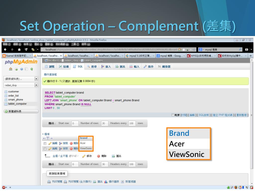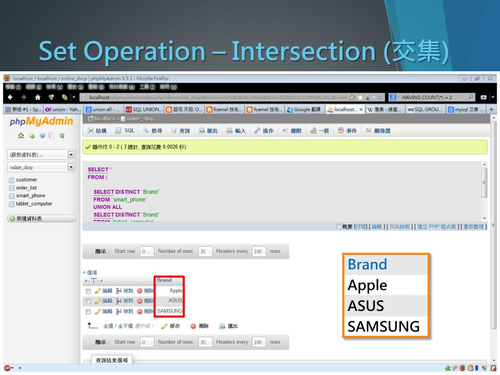 Set Operation – Union (聯集) Query: 找出有販賣手機或平板的品牌 指令語法: SELECT`欄位名稱1`FROM`資料表名稱1` UNION SELECT`欄位名稱2`FROM`資料表名稱2`