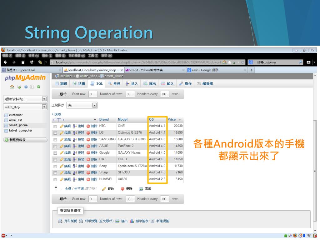String Operation Query: 顯示作業系統為Android之手機 各種Android版本的手機都顯示出來了 指令語法: SELECT`欄位名稱`FROM`資料表名稱` WHERE`欄位名稱` LIKE“%要查詢的字串%” # %代表任何子字串 _代表任何字元