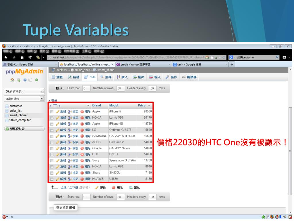 Tuple Variables Query: 排除網站中售價最高的手機 並顯示其他手機 價格22030的HTC One沒有被顯示! 指令語法: SELECT`欄位名稱`FROM`資料表1`, `資料表1` as表格變數名稱 WHERE敘述式 # 由敘述式決定要顯示的東西,重點在於可以利用Tuple Varibles來比較相同表格內的欄位