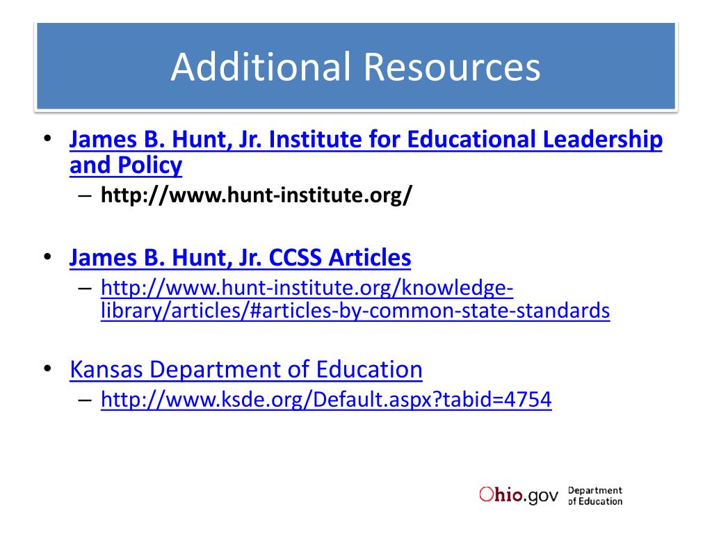 Additional Resources • James B. Hunt, Jr. Institute for Educational Leadership and Policy • http://www.hunt-institute.org/ • James B. Hunt, Jr. CCSS Articles • http://www.hunt-institute.org/knowledge-library/articles/#articles-by-common-state-standards • Kansas Department of Education • http://www.ksde.org/Default.aspx?tabid=4754
