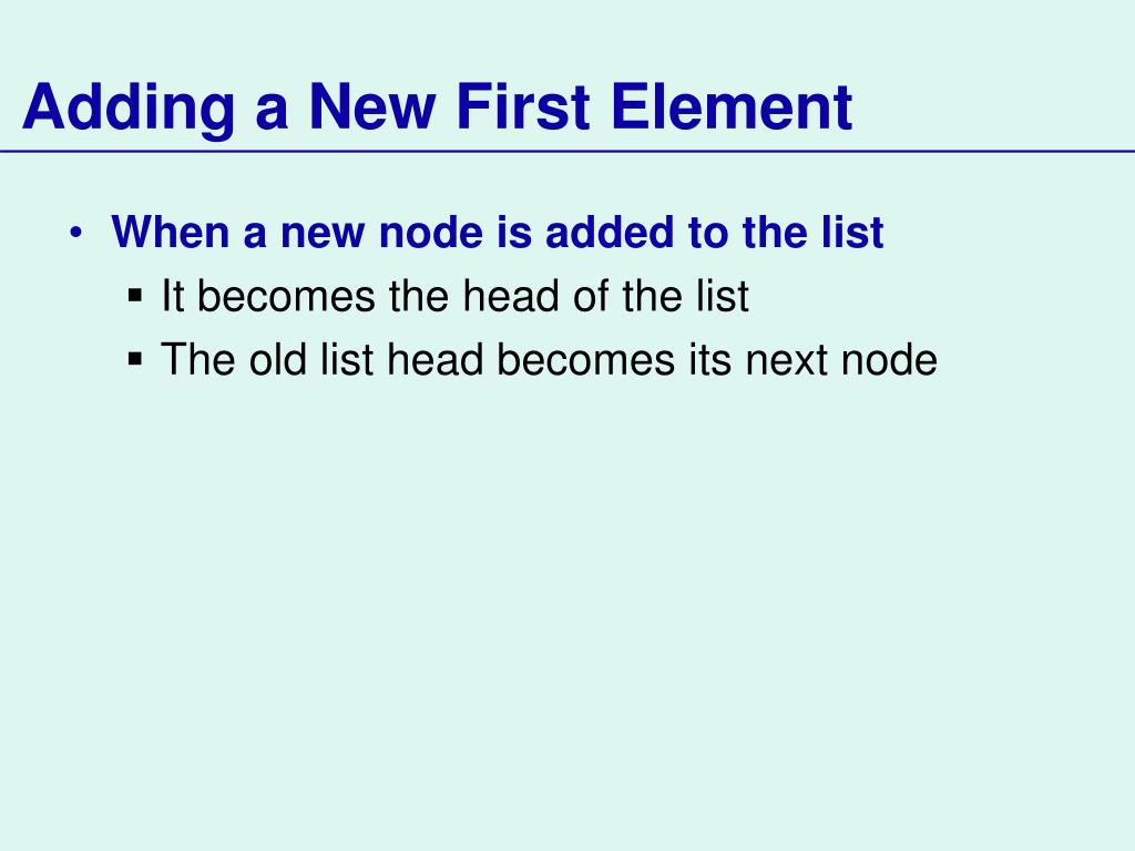 Adding a New First Element • When a new node is added to the list • It becomes the head of the list • The old list head becomes its next node