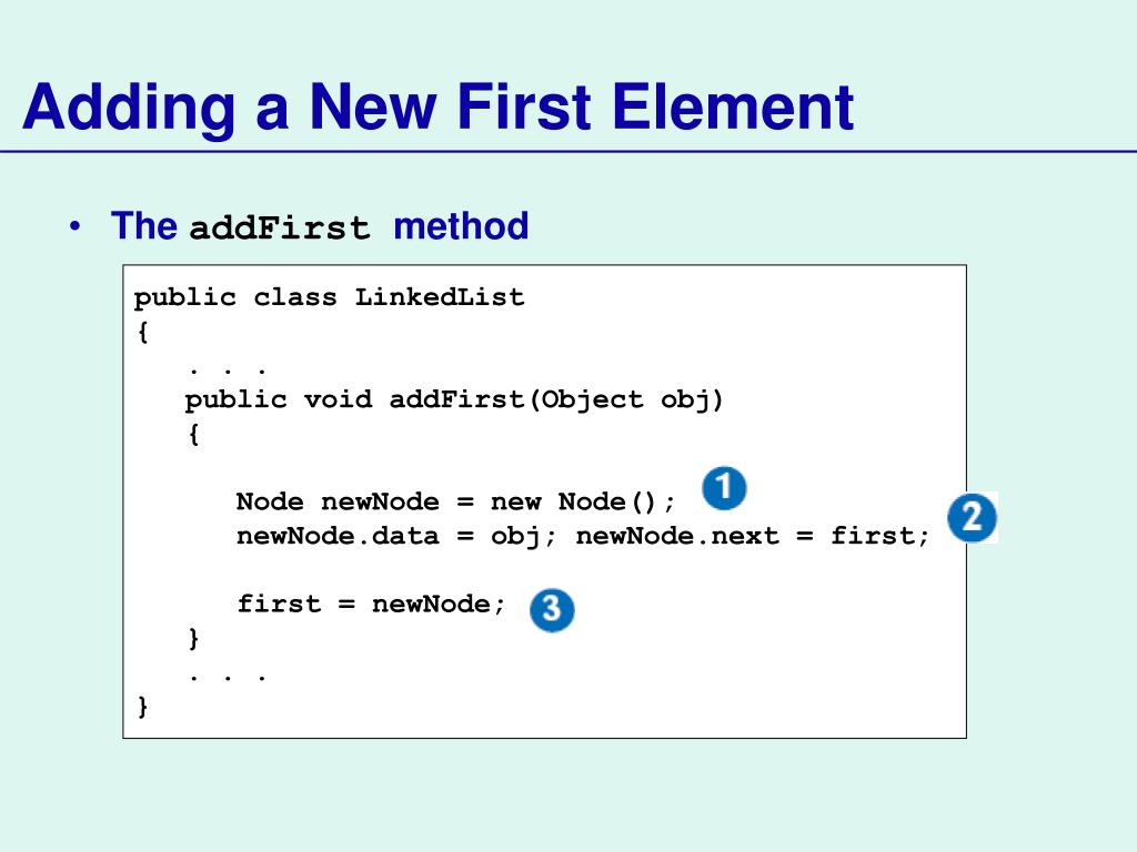 Adding a New First Element • The addFirst method public class LinkedList{ . . . public void addFirst(Object obj) { Node newNode = new Node(); newNode.data = obj; newNode.next = first; first = newNode; } . . . }
