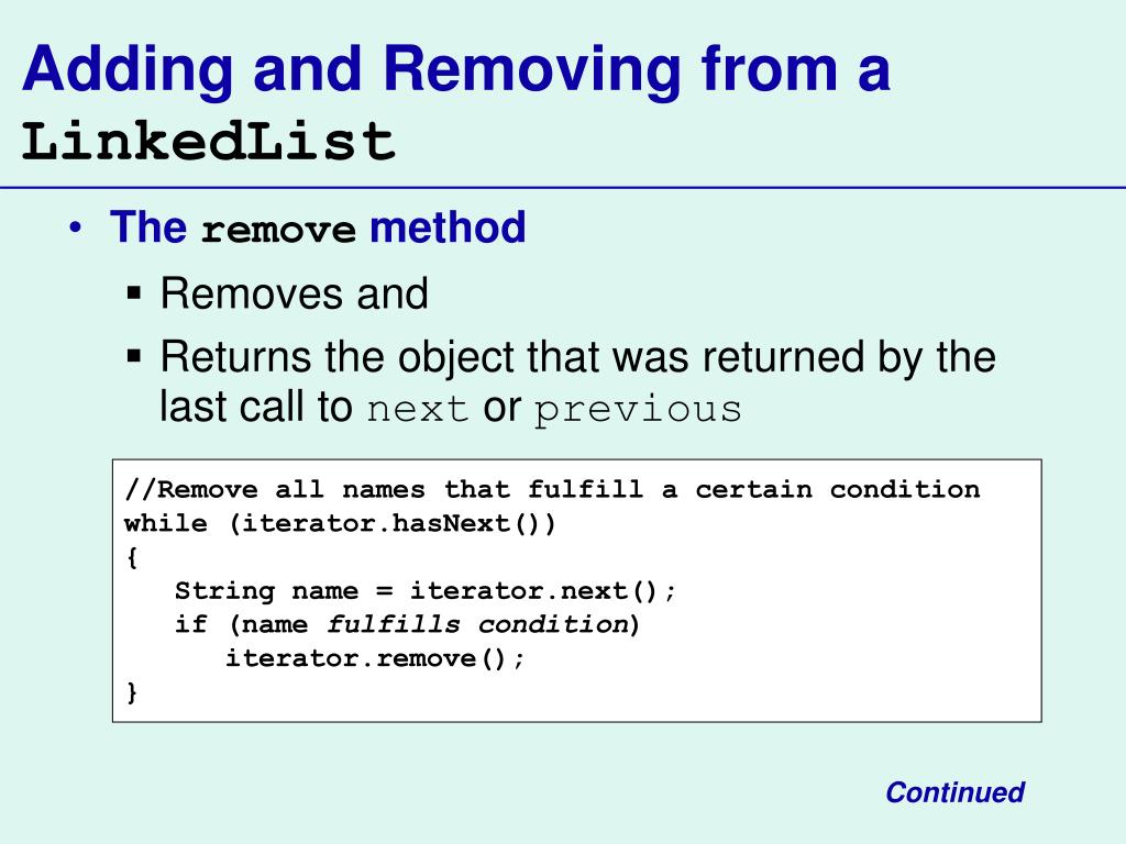 Adding and Removing from a LinkedList • The remove method • Removes and • Returns the object that was returned by the last call to next or previous //Remove all names that fulfill a certain conditionwhile (iterator.hasNext()){ String name = iterator.next(); if (name fulfills condition) iterator.remove();} Continued