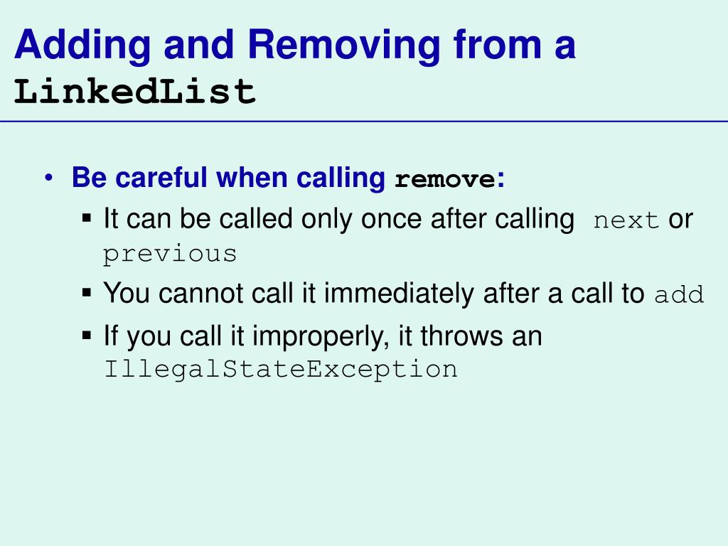 Adding and Removing from a LinkedList • Be careful when calling remove: • It can be called only once after calling next or previous • You cannot call it immediately after a call to add • If you call it improperly, it throws an IllegalStateException