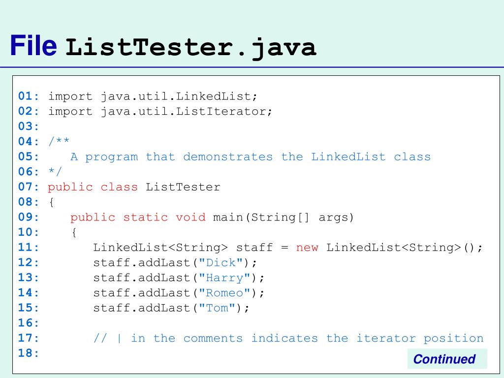 File ListTester.java 01:import java.util.LinkedList; 02:import java.util.ListIterator; 03: 04: /** 05: A program that demonstrates the LinkedList class 06: */ 07:public class ListTester 08:{ 09:public static void main(String[] args) 10: { 11: LinkedList<String> staff = new LinkedList<String>(); 12: staff.addLast("Dick"); 13: staff.addLast("Harry"); 14: staff.addLast("Romeo"); 15: staff.addLast("Tom"); 16: 17: // | in the comments indicates the iterator position 18: Continued