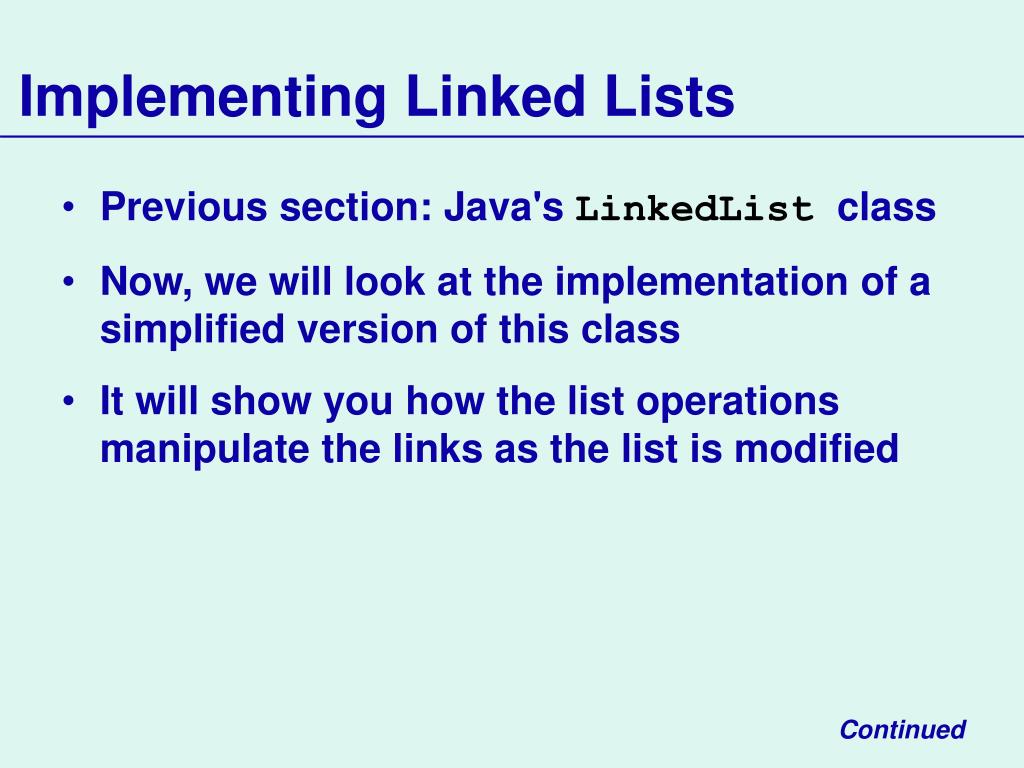 Implementing Linked Lists • Previous section: Java's LinkedList class • Now, we will look at the implementation of a simplified version of this class • It will show you how the list operations manipulate the links as the list is modified Continued