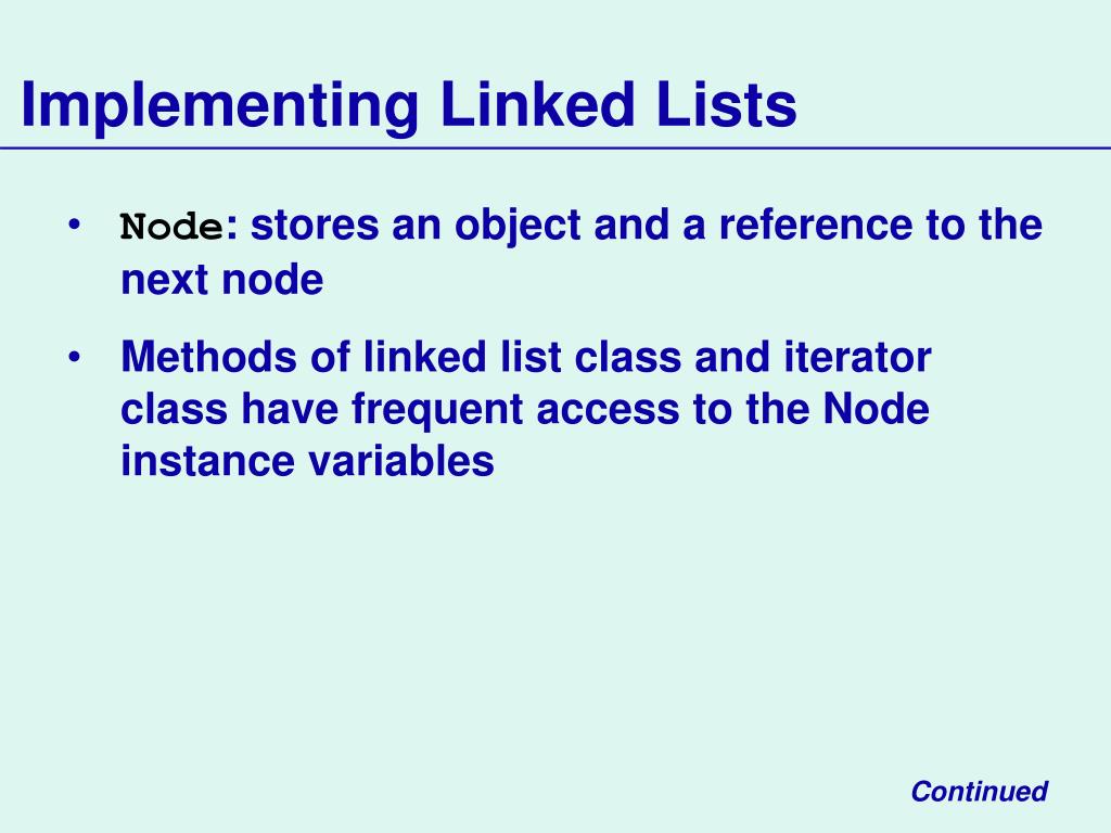 Implementing Linked Lists • Node: stores an object and a reference to the next node • Methods of linked list class and iterator class have frequent access to the Node instance variables Continued