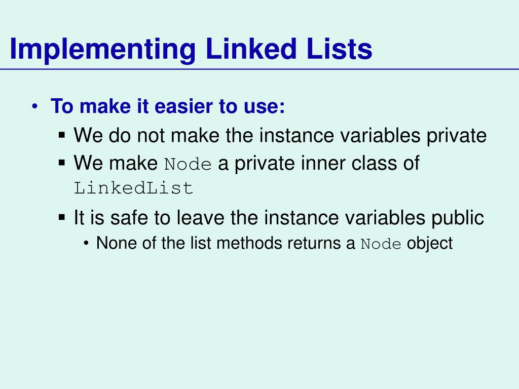 Implementing Linked Lists • To make it easier to use: • We do not make the instance variables private • We make Node a private inner class of LinkedList • It is safe to leave the instance variables public • None of the list methods returns a Node object