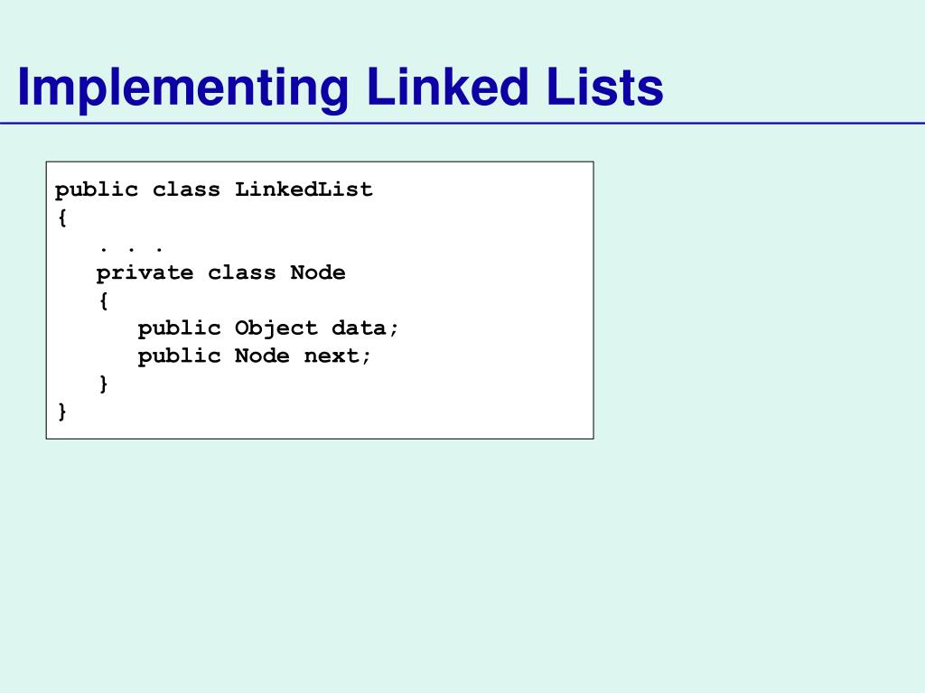 Implementing Linked Lists public class LinkedList{ . . . private class Node { public Object data; public Node next; } }