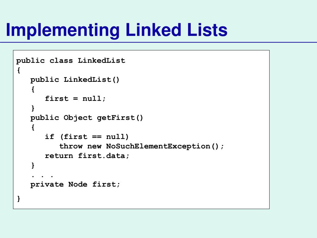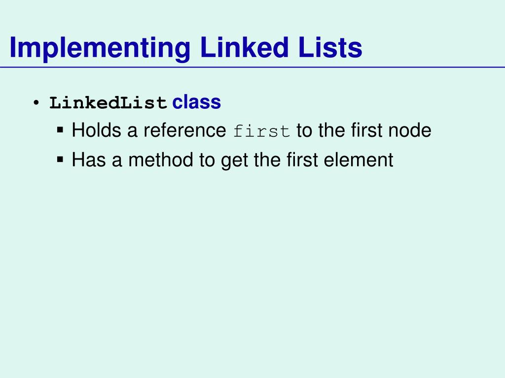 Implementing Linked Lists public class LinkedList{ public LinkedList() { first = null; } public Object getFirst() { if (first == null) throw new NoSuchElementException(); return first.data; } . . . private Node first; }