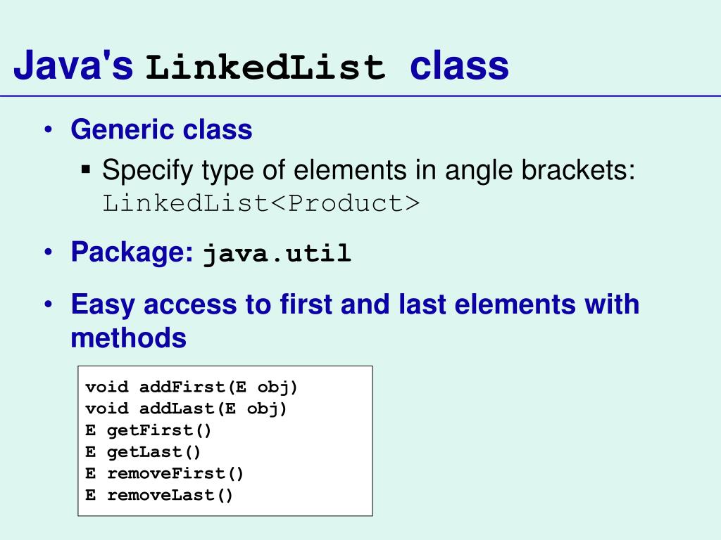 Java's LinkedList class • Generic class • Specify type of elements in angle brackets: LinkedList<Product> • Package: java.util • Easy access to first and last elements with methods void addFirst(E obj)void addLast(E obj)E getFirst()E getLast()E removeFirst()E removeLast()