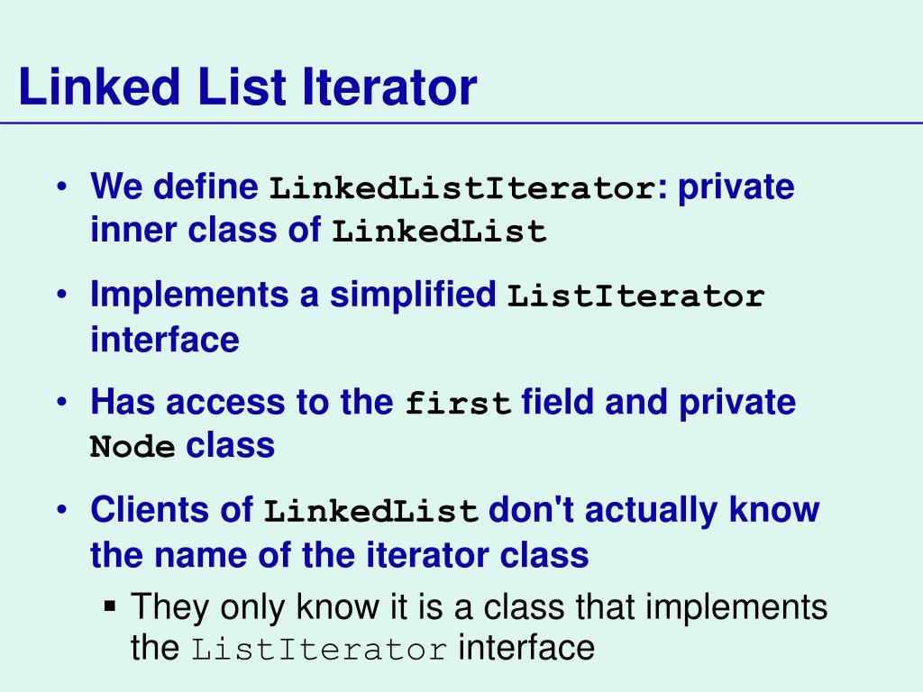 Linked List Iterator • We define LinkedListIterator: private inner class of LinkedList • Implements a simplified ListIterator interface • Has access to the first field and private Node class • Clients of LinkedList don't actually know the name of the iterator class • They only know it is a class that implements the ListIterator interface