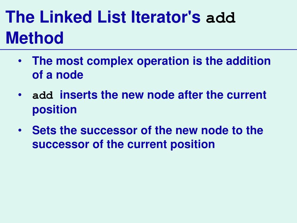 The Linked List Iterator's add Method • The most complex operation is the addition of a node • add inserts the new node after the current position • Sets the successor of the new node to the successor of the current position