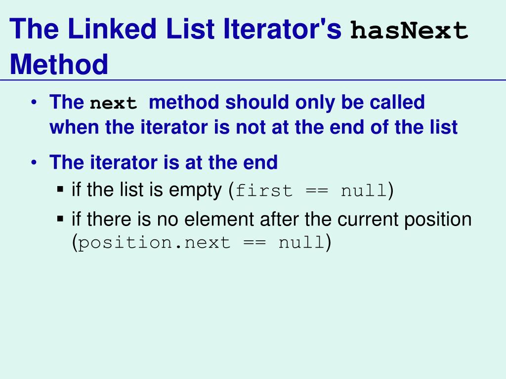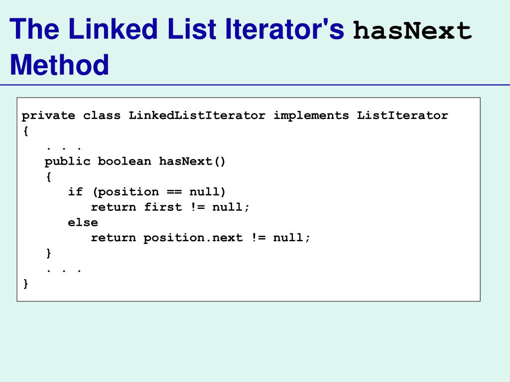 The Linked List Iterator's hasNext Method private class LinkedListIterator implements ListIterator{ . . . public boolean hasNext() { if (position == null) return first != null; else return position.next != null; } . . .}