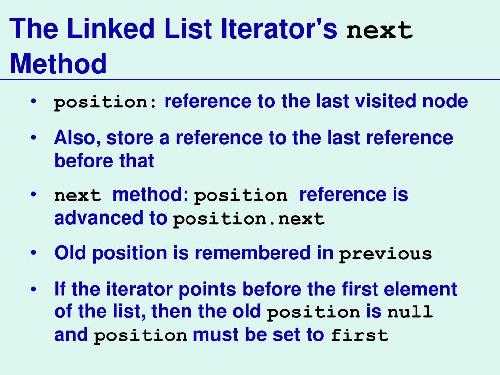 The Linked List Iterator's next Method • position: reference to the last visited node • Also, store a reference to the last reference before that • next method: position reference is advanced to position.next • Old position is remembered in previous • If the iterator points before the first element of the list, then the old position is null and position must be set to first