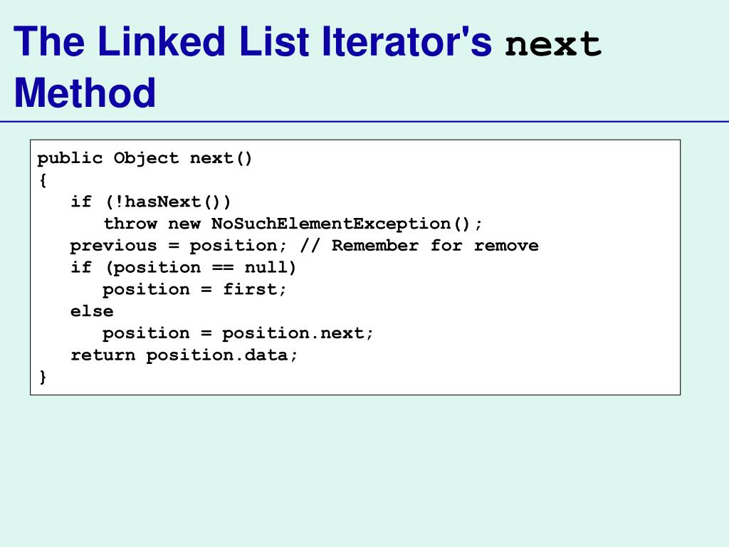 The Linked List Iterator's next Method public Object next(){ if (!hasNext()) throw new NoSuchElementException(); previous = position; // Remember for remove if (position == null) position = first; else position = position.next; return position.data;}
