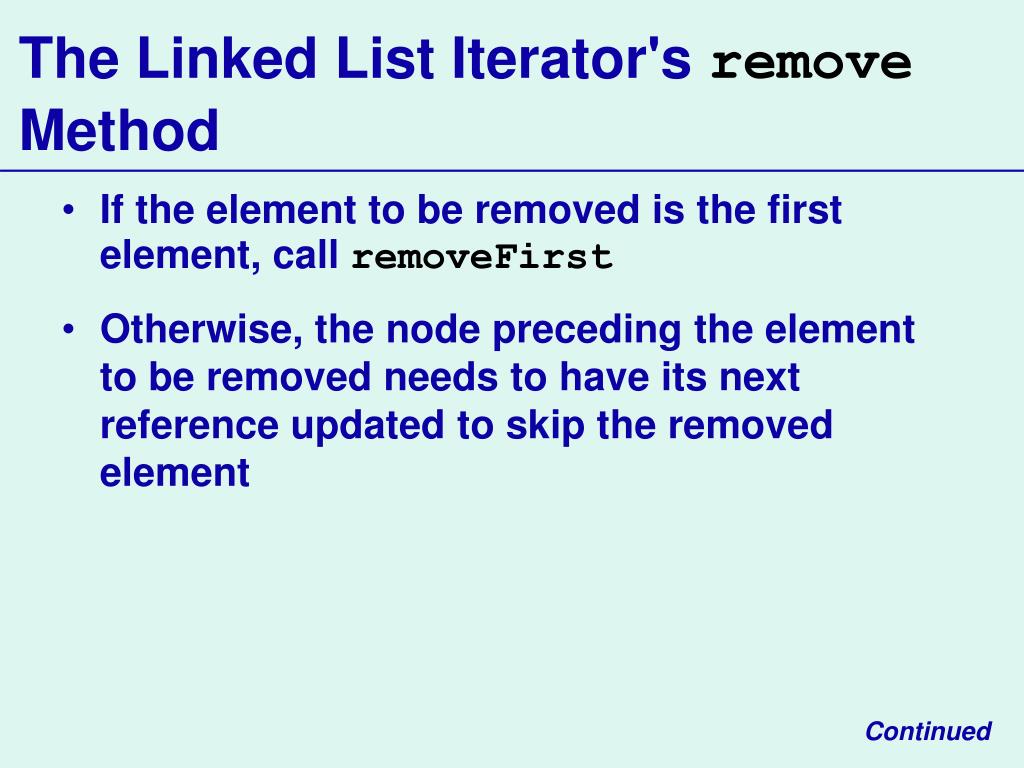 The Linked List Iterator's remove Method • If the element to be removed is the first element, call removeFirst • Otherwise, the node preceding the element to be removed needs to have its next reference updated to skip the removed element Continued
