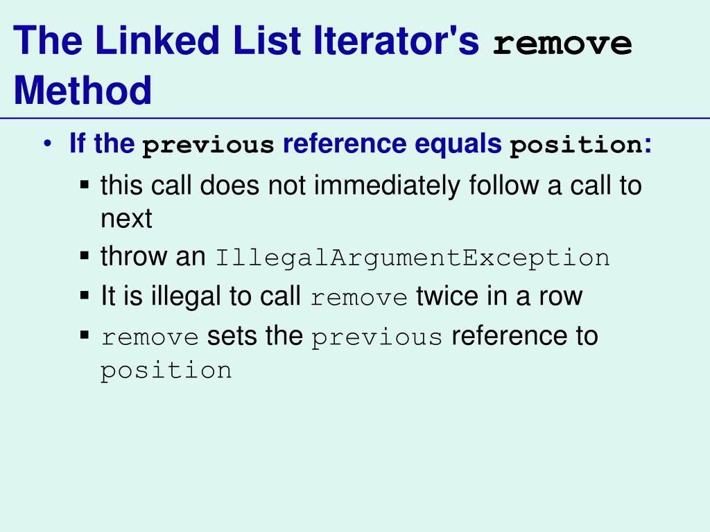 The Linked List Iterator's remove Method • If the previous reference equals position: • this call does not immediately follow a call to next • throw an IllegalArgumentException • It is illegal to call remove twice in a row • remove sets the previous reference to position