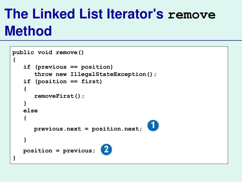 The Linked List Iterator's remove Method public void remove(){ if (previous == position) throw new IllegalStateException(); if (position == first) { removeFirst(); } else { previous.next = position.next; } position = previous; }
