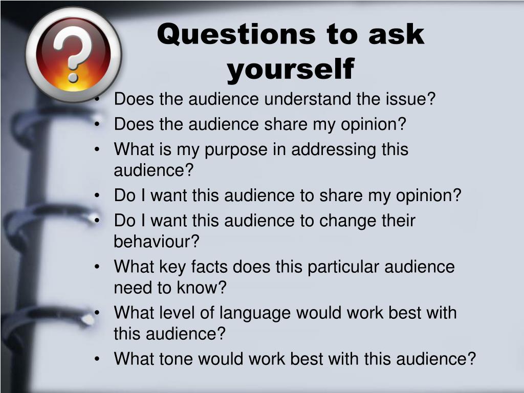 Questions to ask yourself • Does the audience understand the issue? • Does the audience share my opinion? • What is my purpose in addressing this audience? • Do I want this audience to share my opinion? • Do I want this audience to change their behaviour? • What key facts does this particular audience need to know? • What level of language would work best with this audience? • What tone would work best with this audience?