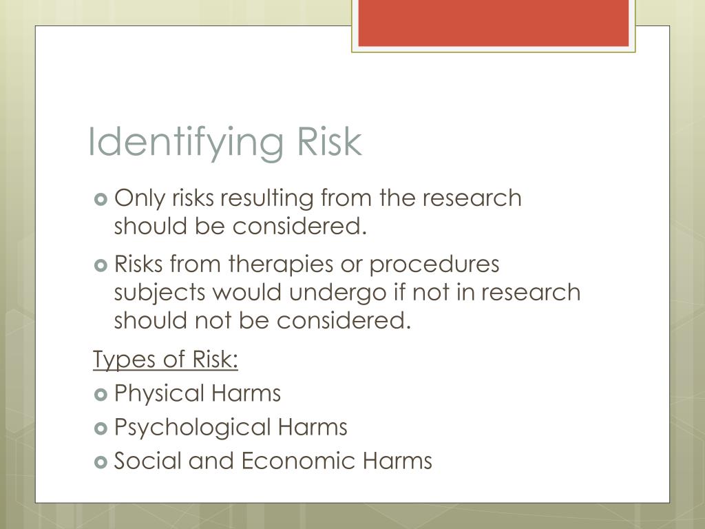 Identifying Risk • Only risks resulting from the research should be considered. • Risks from therapies or procedures subjects would undergo if not in research should not be considered. Types of Risk: • Physical Harms • Psychological Harms • Social and Economic Harms