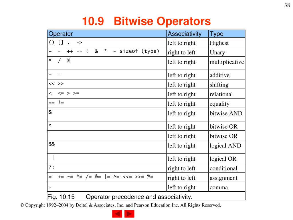 The result of combining the following 65535 = 00000000 00000000 11111111 11111111 1 = 00000000 00000000 00000000 00000001 using the bitwise AND operator & is 1 = 00000000 00000000 00000000 00000001 The result of combining the following 15 = 00000000 00000000 00000000 00001111 241 = 00000000 00000000 00000000 11110001 using the bitwise inclusive OR operator | is 255 = 00000000 00000000 00000000 11111111 The result of combining the following 139 = 00000000 00000000 00000000 10001011 199 = 00000000 00000000 00000000 11000111 using the bitwise exclusive OR operator ^ is 76 = 00000000 00000000 00000000 01001100 The one's complement of 21845 = 00000000 00000000 01010101 01010101 is 4294945450 = 11111111 11111111 10101010 10101010 fig10_09.c (4 of 4) Program Output