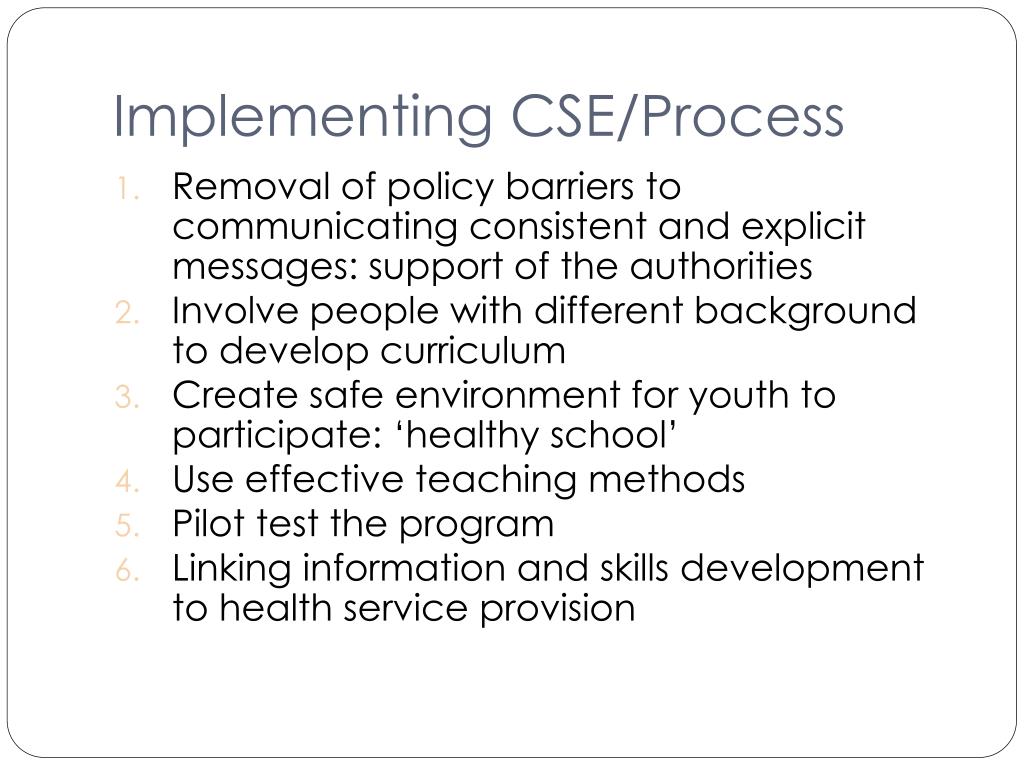 Implementing CSE/Process • Removal of policy barriers to communicating consistent and explicit messages: support of the authorities • Involve people with different background to develop curriculum • Create safe environment for youth to participate: ‘healthy school’ • Use effective teaching methods • Pilot test the program • Linking information and skills development to health service provision