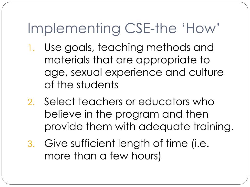 Implementing CSE-the ‘How’ • Use goals, teaching methods and materials that are appropriate to age, sexual experience and culture of the students • Select teachers or educators who believe in the program and then provide them with adequate training. • Give sufficient length of time (i.e. more than a few hours)