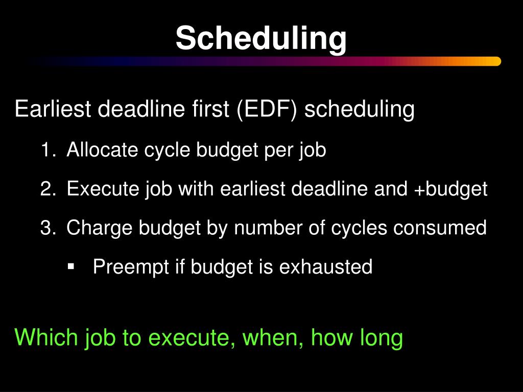 Scheduling • Earliest deadline first (EDF) scheduling • Allocate cycle budget per job • Execute job with earliest deadline and +budget • Charge budget by number of cycles consumed • Preempt if budget is exhausted • Which job to execute, when, how long