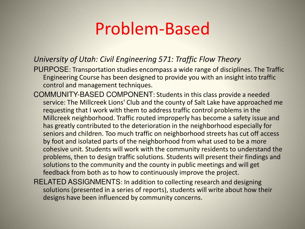 Problem-Based University of Utah: Civil Engineering 571: Traffic Flow Theory PURPOSE: Transportation studies encompass a wide range of disciplines. The Traffic Engineering Course has been designed to provide you with an insight into traffic control and management techniques. COMMUNITY-BASED COMPONENT: Students in this class provide a needed service: The Millcreek Lions' Club and the county of Salt Lake have approached me requesting that I work with them to address traffic control problems in the Millcreek neighborhood. Traffic routed improperly has become a safety issue and has greatly contributed to the deterioration in the neighborhood especially for seniors and children. Too much traffic on neighborhood streets has cut off access by foot and isolated parts of the neighborhood from what used to be a more cohesive unit. Students will work with the community residents to understand the problems, then to design traffic solutions. Students will present their findings and solutions to the community and the county in public meetings and will get feedback from both as to how to continuously improve the project. RELATED ASSIGNMENTS: In addition to collecting research and designing solutions (presented in a series of reports), students will write about how their designs have been influenced by community concerns.