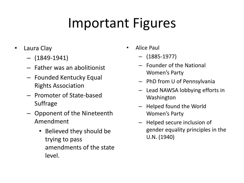 Important Figures • Laura Clay • (1849-1941) • Father was an abolitionist • Founded Kentucky Equal Rights Association • Promoter of State-based Suffrage • Opponent of the Nineteenth Amendment • Believed they should be trying to pass amendments of the state level. • Alice Paul • (1885-1977) • Founder of the National Women’s Party • PhD from U of Pennsylvania • Lead NAWSA lobbying efforts in Washington • Helped found the World Women’s Party • Helped secure inclusion of gender equality principles in the U.N. (1940)