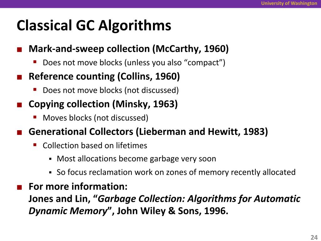 Classical GC Algorithms • Mark-and-sweep collection (McCarthy, 1960) • Does not move blocks (unless you also “compact”) • Reference counting (Collins, 1960) • Does not move blocks (not discussed) • Copying collection (Minsky, 1963) • Moves blocks (not discussed) • Generational Collectors (Lieberman and Hewitt, 1983) • Collection based on lifetimes • Most allocations become garbage very soon • So focus reclamation work on zones of memory recently allocated • For more information: Jones and Lin, “Garbage Collection: Algorithms for Automatic Dynamic Memory”, John Wiley & Sons, 1996.