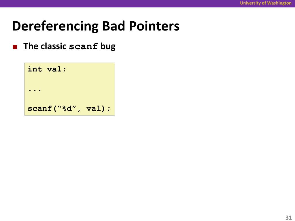 Dereferencing Bad Pointers • The classic scanf bug intval; ... scanf(“%d”, val);