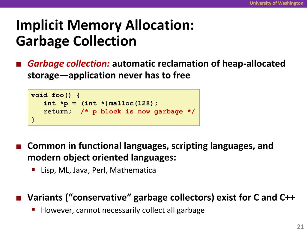 Implicit Memory Allocation:Garbage Collection • Garbage collection: automatic reclamation of heap-allocated storage—application never has to free • Common in functional languages, scripting languages, and modern object oriented languages: • Lisp, ML, Java, Perl, Mathematica • Variants (“conservative” garbage collectors) exist for C and C++ • However, cannot necessarily collect all garbage void foo() { int *p = (int *)malloc(128); return; /* p block is now garbage */ }
