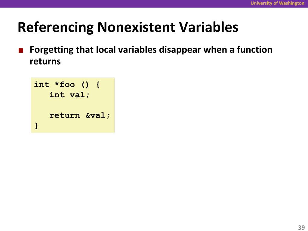 Referencing Nonexistent Variables • Forgetting that local variables disappear when a function returns int *foo () { int val; return &val; }