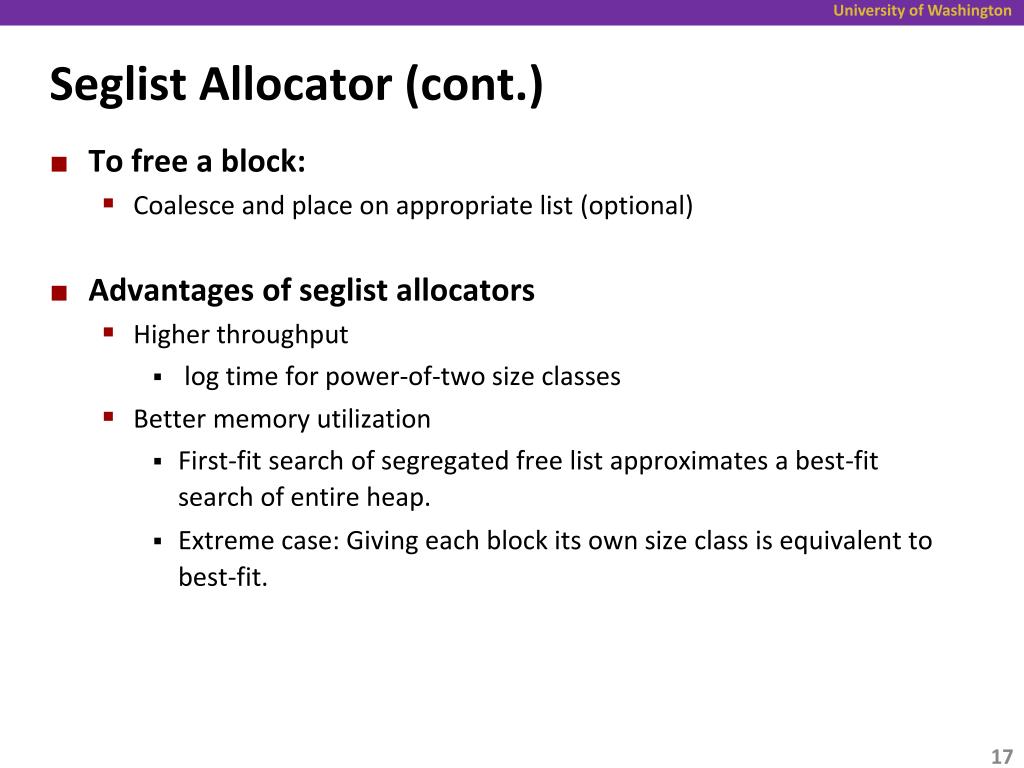 Seglist Allocator (cont.) • To free a block: • Coalesce and place on appropriate list (optional) • Advantages of seglist allocators • Higher throughput • log time for power-of-two size classes • Better memory utilization • First-fit search of segregated free list approximates a best-fit search of entire heap. • Extreme case: Giving each block its own size class is equivalent to best-fit.