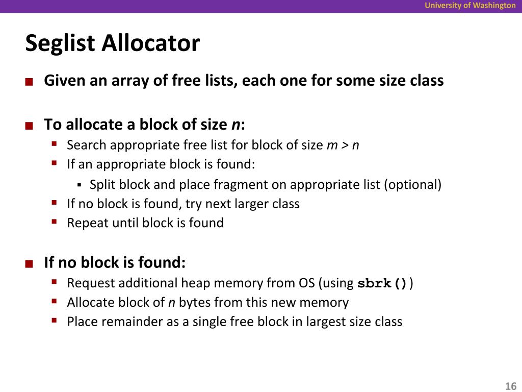Seglist Allocator • Given an array of free lists, each one for some size class • To allocate a block of size n: • Search appropriate free list for block of size m > n • If an appropriate block is found: • Split block and place fragment on appropriate list (optional) • If no block is found, try next larger class • Repeat until block is found • If no block is found: • Request additional heap memory from OS (using sbrk()) • Allocate block of n bytes from this new memory • Place remainder as a single free block in largest size class