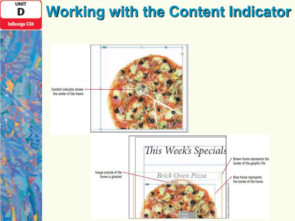 Working with the Content Indicator • Content indicator • Donut-shaped icon • Appears over a placed graphic when Selection tool is moved over the graphic • Allows you to move a graphic in a frame without moving the frame • Image can be dragged until it is cropped to your liking • Cropping: hiding part of the image without permanently removing it
